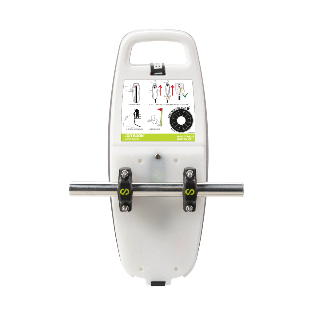 The inflatable Jon Buoy Danbuoy is stylish, compact and weighs only 2.9kg. It can be mounted on a rail up to 30MM diameter and is easily deployed in an emergency. In the event of a man overboard, simply unclip the unit from its mounting bracket and throw; the Danbuoy then automatically inflates. It and is also fitted with a automatic light and whistle.